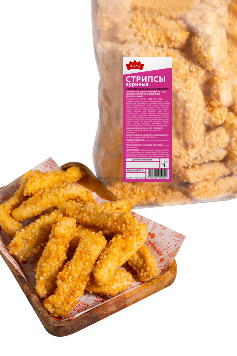 Стрипсы KURU - идеальное сочетание нежного куриного филе и хрустящих рисовых шариков. Приготовлены по ресторанной технологии - тщательно запанированы вручную и обжарены до полной готовности.